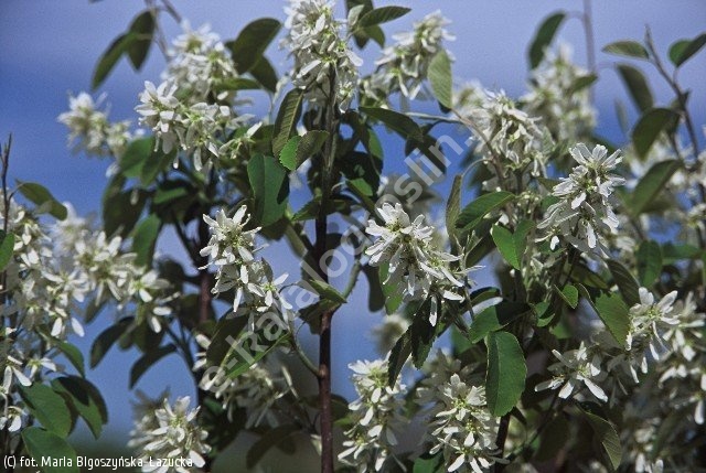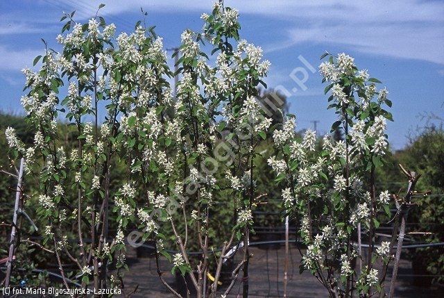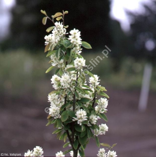 Wielopniowy krzew lub małe drzewko obficie kwitnące wiosną, a ze względu na kolumnowy pokrój dekoracyjne także zimą. Dorasta do 3-5 m wysokości i 1,5 m szerokości. Pędy sztywne. Kora na młodych pędach czerwonobrązowa, na starszych szara. Liście ciemnozielone, owalne, z lekko ząbkowanymi brzegami, jesienią przebarwiają się na żółto. Kwiaty drobne, białe, zebrane w grona. Kwitnie obficie w kwietniu. Owoce małe, okrągłe, fioletowe, zebrane w kiście, dojrzewają w czerwcu. Roślina o małych wymaganiach glebowych, wytrzymała na suszę i mróz, toleruje zarówno stanowiska słoneczne jak i częściowo ocienione. Ze względu na swój pokrój świetnie nadaje się do małych ogrodów i nasadzeń w formie nieformowanych szpalerów.