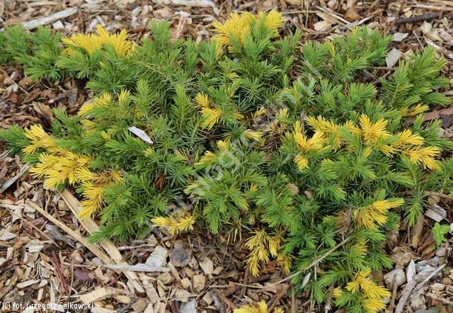Wolno rosnący, iglasty krzew okrywowy o dwubarwnych, złocisto-zielonych gałązkach. Odmiana wprowadzona do handlu na przełomie XX i XXI wieku. Rośnie zdecydowanie wolniej od innych odmian jałowca nadbrzeżnego, tworząc niewielkie dwubarwne poduszki. Po 10 latach uprawy dorasta do 0,2 m wysokości i około 0,5 m szerokości. Pędy są krótkie, rozpostarte na wszystkie strony, ścielące się po ziemi. Gałązki obficie i gęsto ulistnione, zielone z licznymi zabarwionymi na żółto fragmentami rozproszonymi przypadkowo w obrębie rośliny. Część gałązek jest całkowicie żółta, inne są częściowo odbarwione, pozostałe są zielone. Igły są gęsto ułożone na pędach, skupione po 3 w okółkach, rynienkowate (w przekroju trójkątne), mają do 1,5 cm długości, są ostro zakończone, w dotyku kłujące. Wymagania glebowe i wilgotnościowe wyższe, niż innych gatunków jałowców (krzewy mogą cierpieć od mrozu i suszy). Najlepiej rośnie na stanowiskach słonecznych i ciepłych. We wschodnich rejonach kraju, szczególnie przy braku pokrywy śnieżnej, może przemarzać, dlatego zaleca się okrywać rośliny stroiszem. Na pozostałym obszarze Polski zimują dobrze. Odmiana polecana do sadzenia w ogrodach skalnych, na wrzosowiskach oraz murkach skalnych.