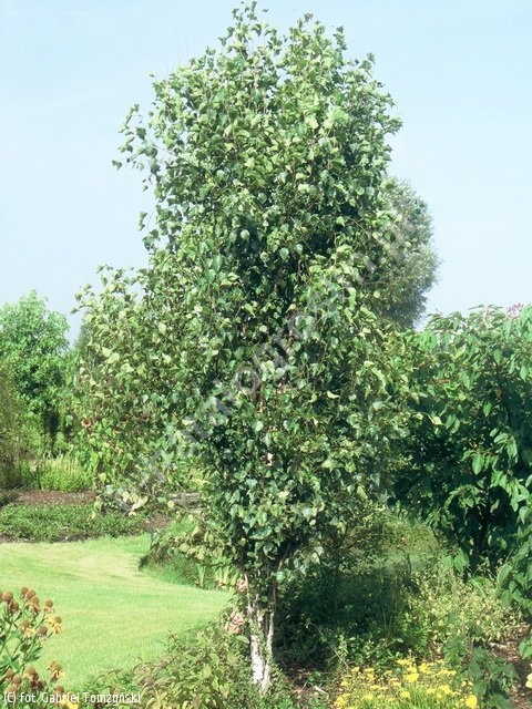 Drzewo o wąskim, kolumnowym pokroju, dorastające do 10-12 m wys. i 4 m szer. Z czasem korona staje się wąskojajowata. Gałęzie sztywne, skierowane pionowo do góry, często nieregularnie pogięte. Kora ozdobna, na młodych pędach ciemna, później biała i gładka, łuszcząca się okrężnie, na starych drzewach mocno spękana. Liście jasnozielone, nagie, małe, 3 - 7 cm dł., jajowatoromboidalne lub trójkątne, z ostrym wierzchołkiem, wcześnie rozwijają się na wiosnę, jesienią stają się żółte. Gatunek światłolubny. Drzewo typowe dla terenów jałowych, suchych i piaszczystych, ale dobrze rośnie w każdych warunkach. Znosi zanieczyszczenie powietrza. Odmiana szczególnie dekoracyjna zimą, kiedy widać strukturę korony. Dobra do sadzenia pojedynczo i w szpalerach w założeniach krajobrazowych, w miejskich i wiejskich parkach i ogrodach.