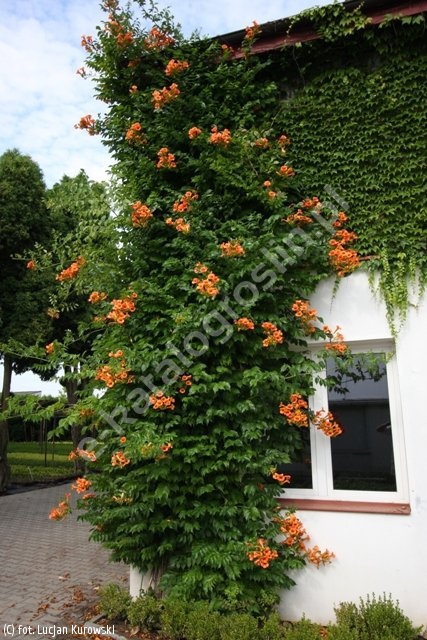 Pnącze o średnio silnym wzroście i silnej budowie, osiągające 2-3 m wysokości. Liście ładne, błyszczące; złożone z 9-12 eliptycznych, jasnozielonych, ostro zakończonych listków, lekko ząbkowanych na bokach. Kwiaty bardzo atrakcyjne, jasnopomarańczowe, trąbkowate, około 10-12 cm długości, z żółtymi pylnikami. Kwitnie obficie od lipca do połowy września. Najlepiej kwitnie na stanowiskach ciepłych, nasłonecznionych, osłoniętych, niezbyt żyznych i niezbyt mokrych. Wspina się przy pomocy korzeni czepnych, ale w młodości wymaga podwiązywania. Nadaje się do sadzenia przy różnych podporach np. altanach, pergolach. Szczególnie przydatna do pokrywania ścian i mocnych podpór. W ostre zimy może przemarzać, ale dobrze się regeneruje. Może być uprawiana w cieplejszych rejonach Polski i w miejscach o łagodnym klimacie.