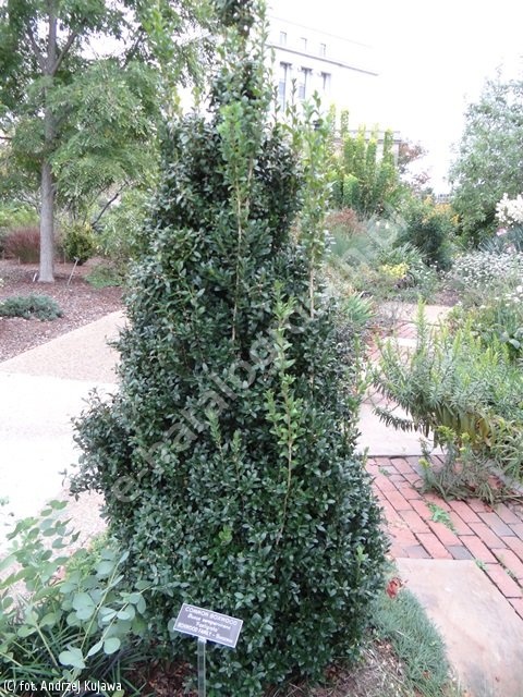 Zimozielony krzew o zwartym, kolumnowym pokroju i niezbyt szybkim tempie wzrostu. Po wielu latach osiąga do 3-4 m wysokości i 1 m szerokości. Liście ciemnozielone, skórzaste owalne, lśniące, o wielkości typowej dla gatunku. Nie posiada dużych wymagań glebowych, dobrze rośnie na każdej przeciętnej glebie ogrodowej, z wyjątkiem zalewanych i skrajnie słabych, piaszczystych. Może być sadzony w pełnym słońcu i w półcieniu. Toleruje pełne zacienienie. Dobrze znosi suszę i niskie temperatury, ale może cierpieć od wysuszających wiatrów i wczesnowiosennych wahań temperatury. Wskazane jest stanowisko osłonięte. W celu uniknięcia deformacji, zimą wskazane jest strząsanie mokrego śniegu. Odmiana o dość nietypowym pokroju dla bukszpanu. Może być wykorzystana do tworzenia żywopłotów formowanych. Dobrze będzie się prezentować sadzona pojedynczo lub w grupie, po kilka sztuk razem.