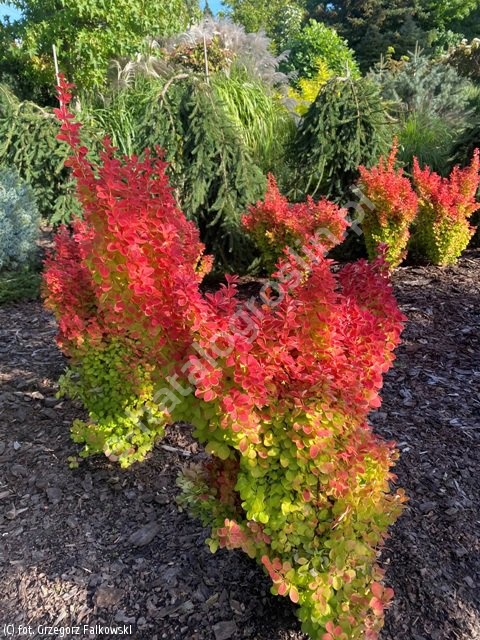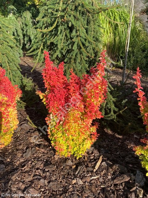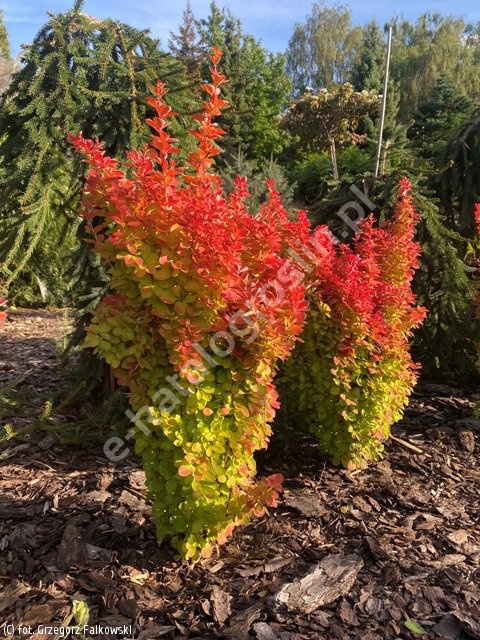 Karłowy krzew liściasty o zwartym, kolumnowy pokroju i wolnym tempie wzrostu. Po 6 latach uprawy dorasta do 60-70 cm wysokości. Pędy są proste, wzniesione, liście owalne, pomarańczowo-miedziane, jesienią przebarwiają się w intensywnych odcieniach czerwieni i pomarańczu. Żółte, drobne kwiaty pojawiają się na wiosnę wraz z rozwijającymi się liśćmi. Czerwone, drobne jagody dojrzewają we wrześniu. Krzew tolerancyjny w stosunku do podłoża, dobrze rośnie na przeciętnych, przepuszczalnych glebach ogrodowych na stanowiskach słonecznych. Odmiana odporna na mróz, strefa 5b, polecana do małych ogrodów, na rabaty, do sadzenia w pojemnikach ustawianych na balkonach i tarasach oraz do tworzenia barwnych kompozycji z innymi krzewami i bylinami o ciemnym ulistnieniu. Roślina zgłoszona do Konkursu Roślin Nowości wystawy 'Zieleń to Życie' w 2016 r. przez Szkółki Roślin Ozdobnych WAŻYŃSCY.