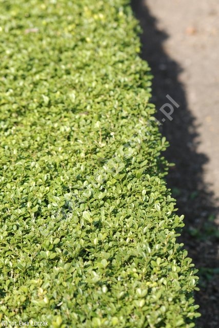 Zimozielony, szeroki krzew o zwartym pokroju. Dorasta do wys. 2,5-4 m. Liście szerokoeliptyczne lub prawie okrągłe, niebieskawozielone, skórzaste, błyszczące. Gleby przeciętne, obojętne do wapiennych, znosi suszę i pełne zacienienie. Mrozoodporność dość dobra. Doskonale znosi cięcie - odpowiednia na strzyżone żywopłoty, obwódki i wszelkie geometryczne formy ogrodowe.